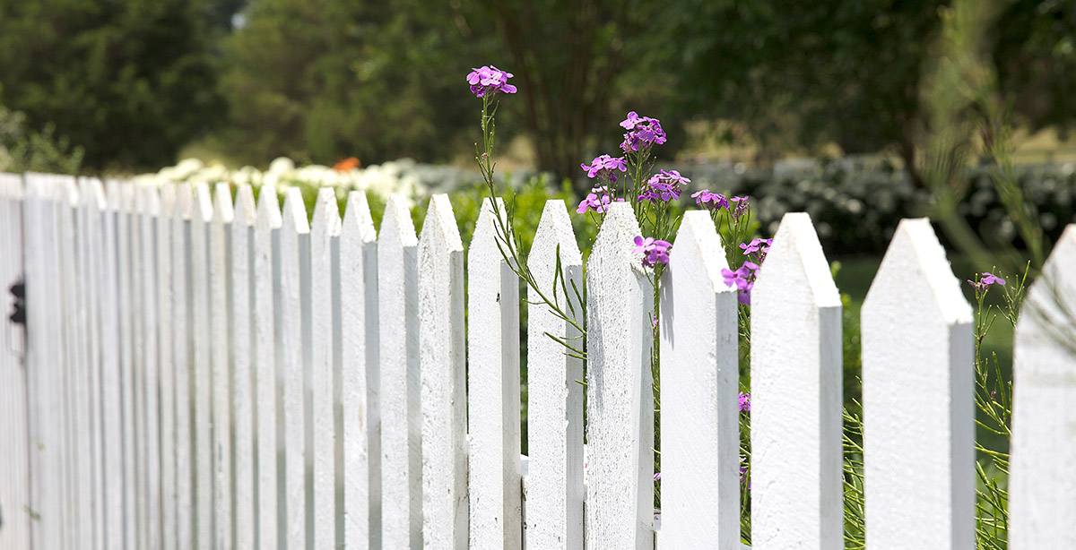 white vinyl picket fence on green lawn surrounding property grounds for backyard protection and privacy wall